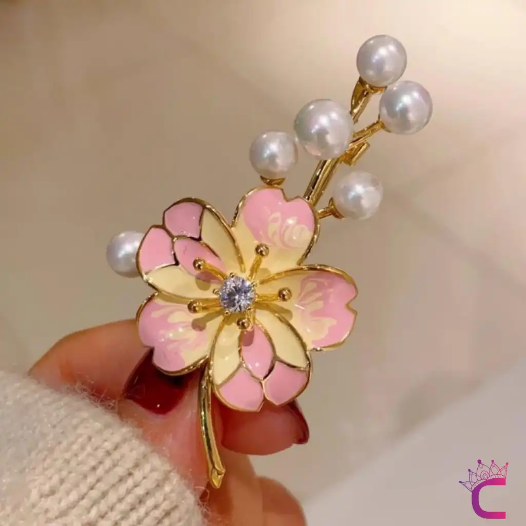 - Zarif tasarımıyla dikkat çeken pembe sarı çiçek desenleri, beyaz inci detayları ile zenginleştirilmiş bu broş, şıklığınızı tamamlar.