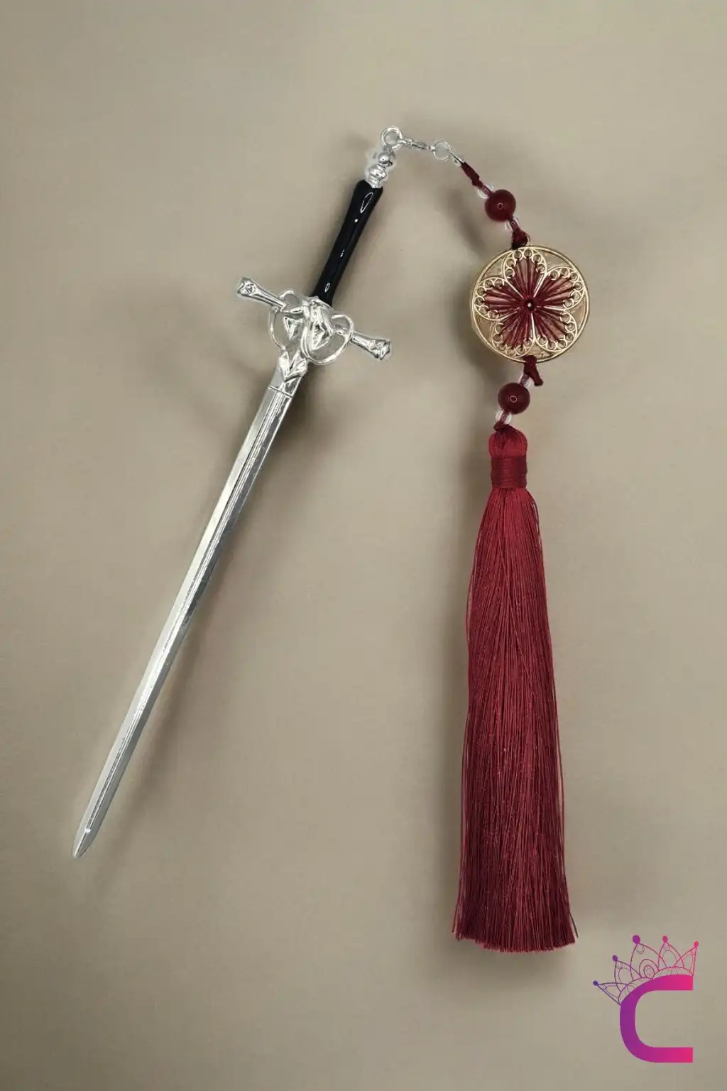 Sallantılı Bordo Püsküllü Kılıç Tasarım Metal Saç Topuz Tokası 20cm - Gümüş Vintage Çubuk Topuz Toka