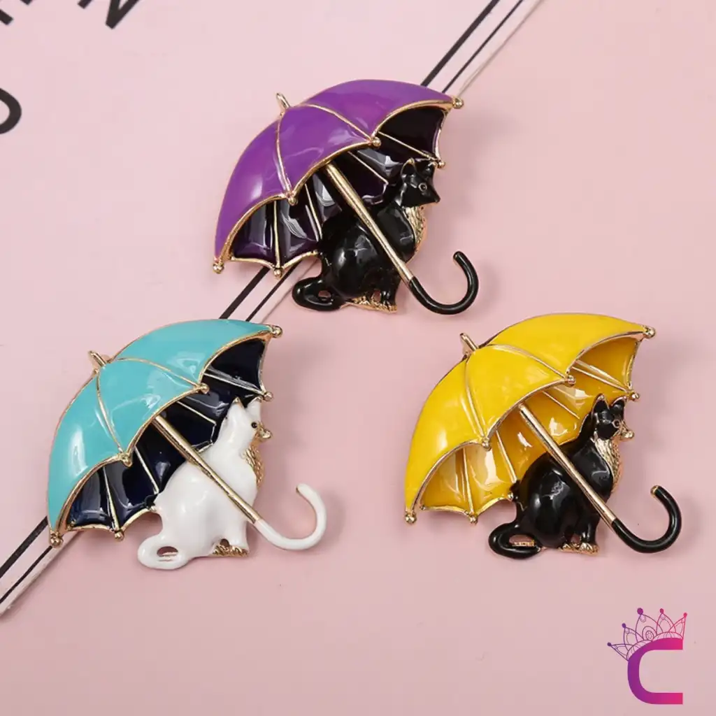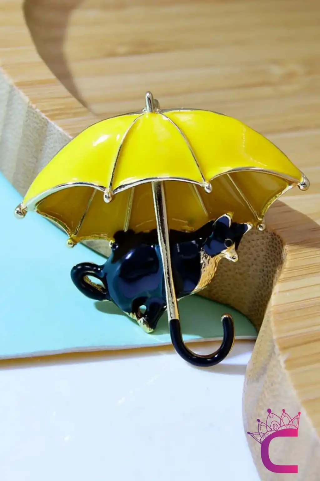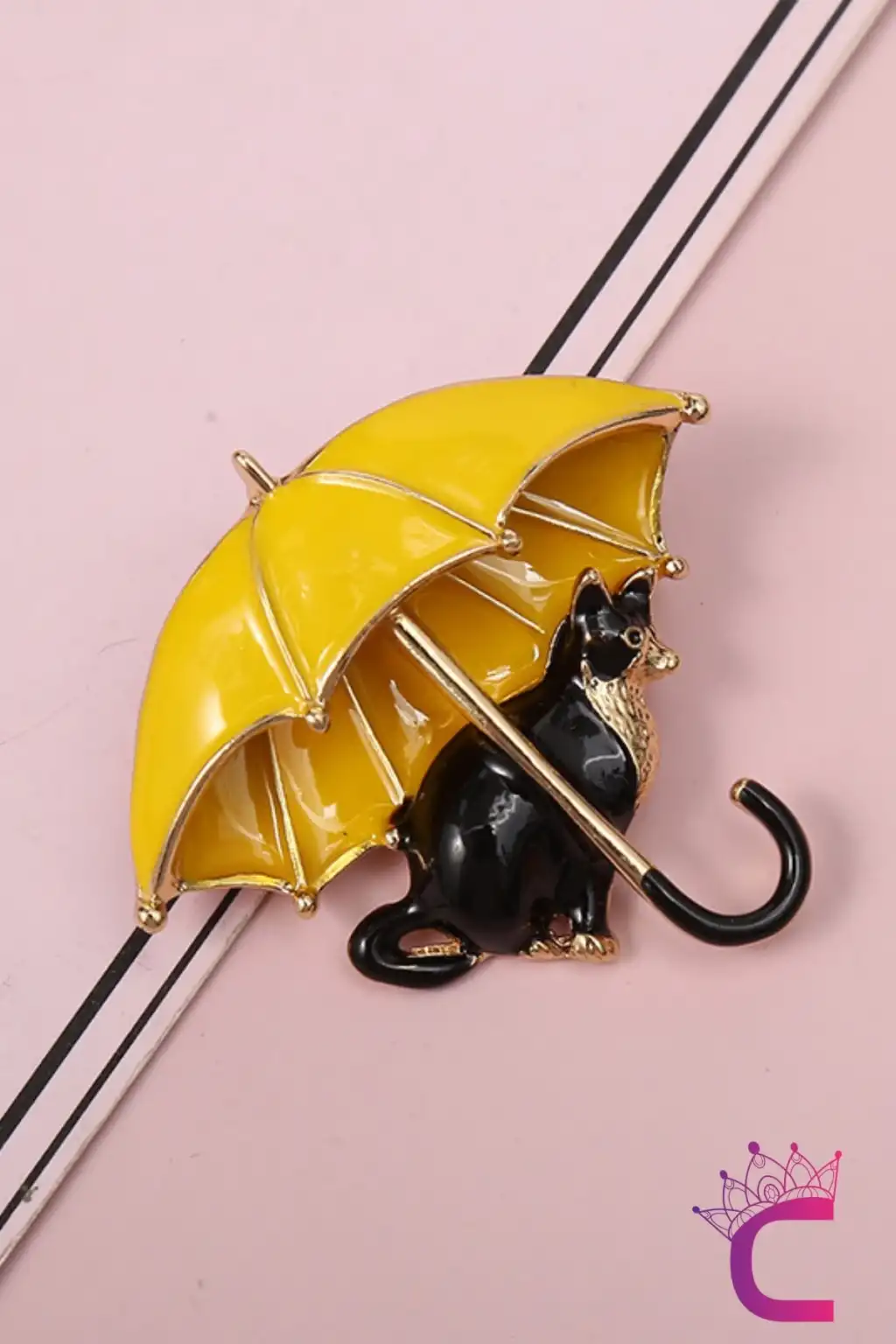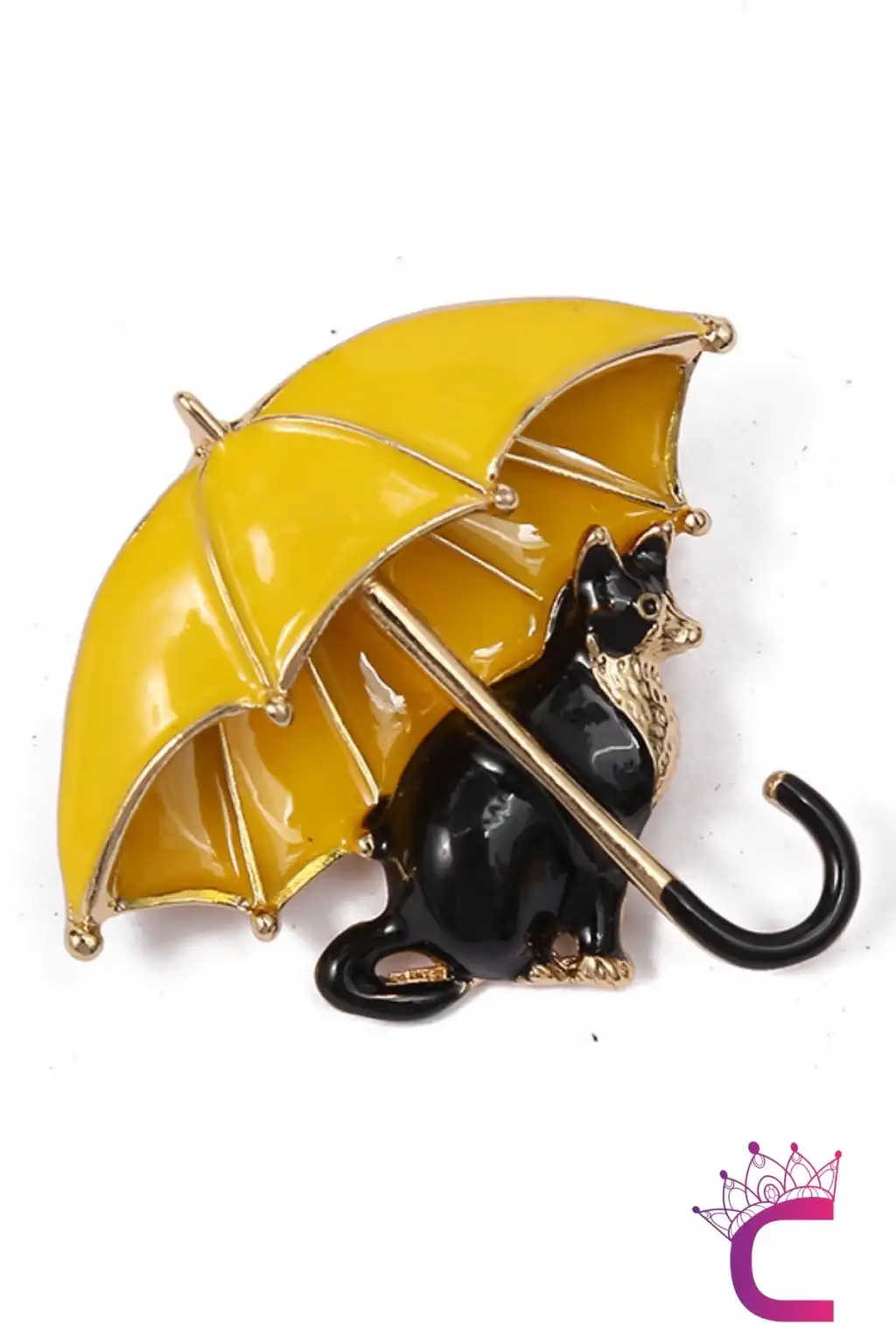 Sarı Şemsiyeli Siyah Kedi Tasarım Broş - Kedili Hediyelik Elbise Ceket Yaka İğnesi Broşu