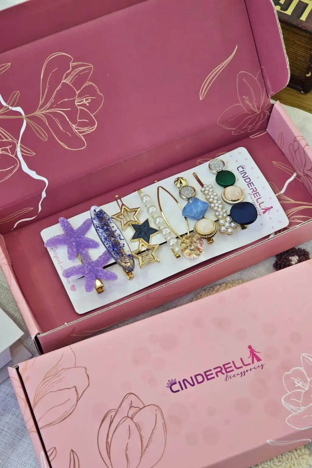 - Sevgiliye özel tasarlanmış, içinde lüks kadın toka aksesuar seti bulunan çiçeklerle süslenmiş şık ve zarif bir hediye kutusu seçeneği.