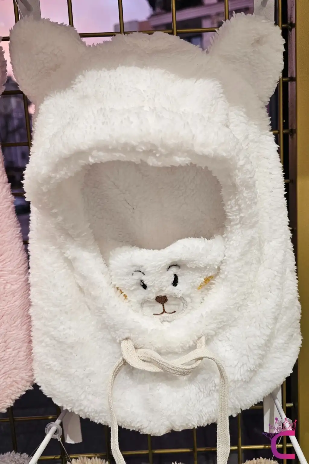 Sevimli Ayıcıklı Yumuşak Peluş Bere Boyunluklu Şapka Atkı Bir Arada Beyaz 3-12 Yaş Kışlık Hediyelik