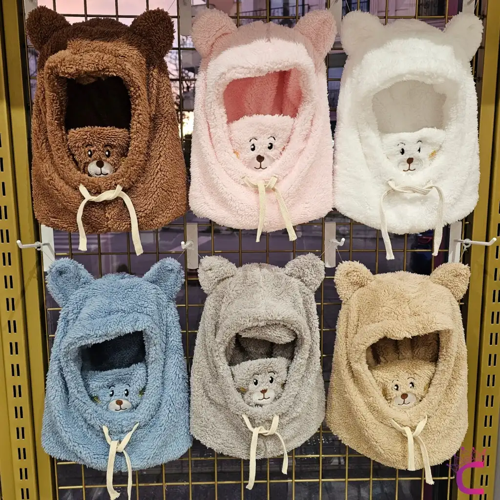 Sevimli Ayıcıklı Yumuşak Peluş Bere Boyunluklu Şapka Atkı Bir Arada Pembe 3-12 Yaş Kışlık Hediyelik