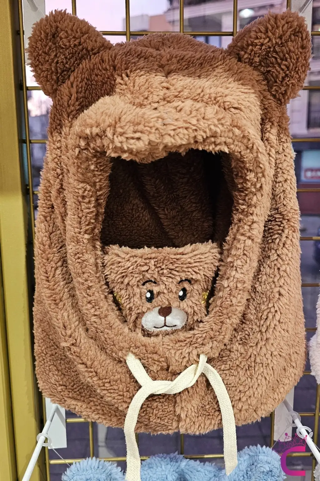 Sevimli Ayıcıklı Yumuşak Peluş Bere Boyunluklu Şapka Atkı Bir Arada Kahve 3-12 Yaş Kışlık Hediyelik