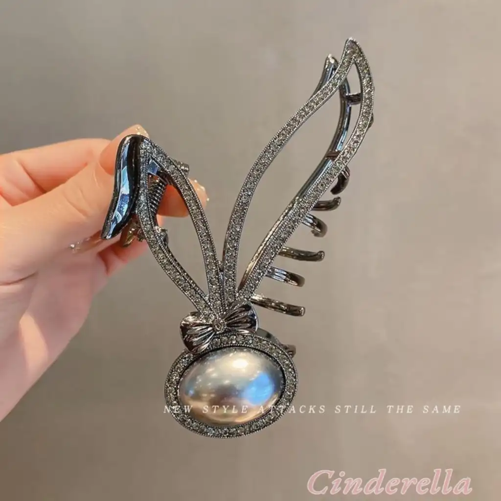 Siyah Yeni Trend Büyük İnci Detaylı Taşlı Kadın Metal Mandal Toka - Lüks Mandallı Saç Tokası