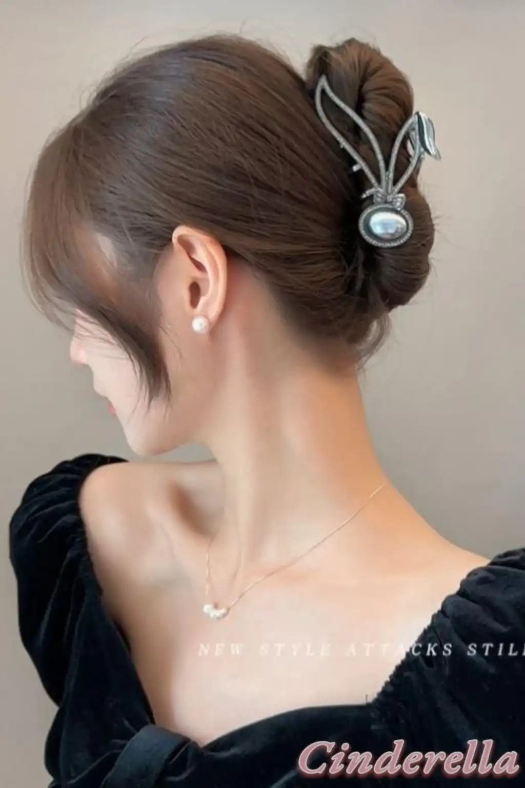 Vintage Retro Şık Siyah Renkli İncili Kıstırmalı Saç Tokası 11cm - Topuz Tokası Klipsli Toka