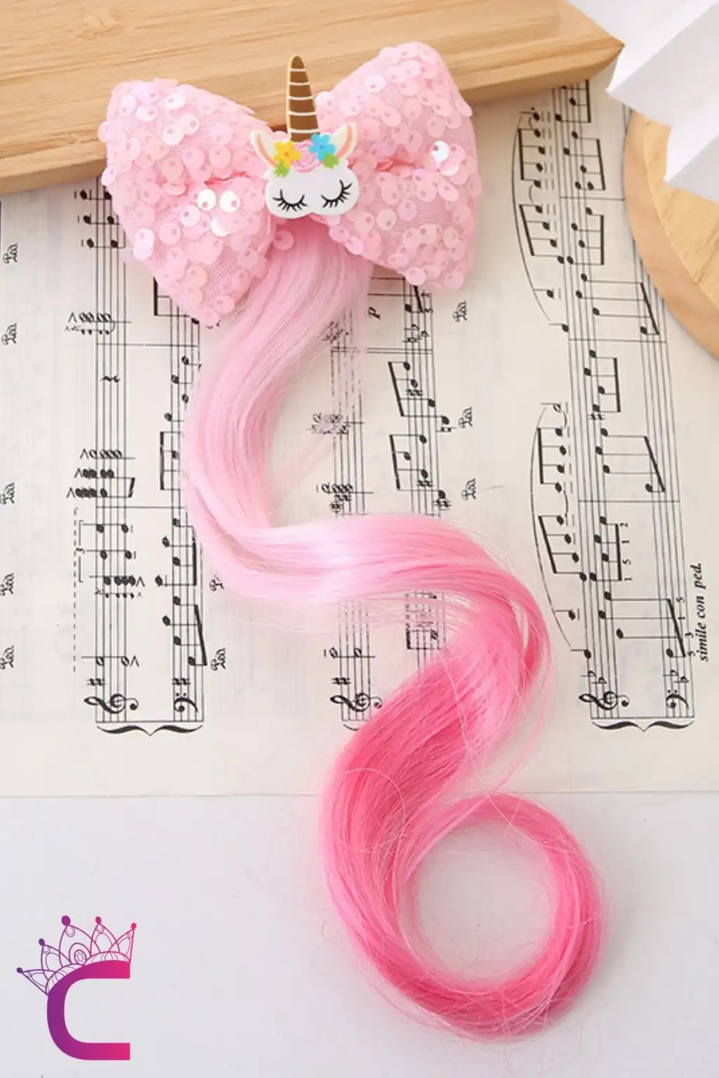- Renkli unicorn deseniyle süslenmiş, kız çocuklarının saçlarını şık bir şekilde tamamlayan pembe pullarla kaplı toka.