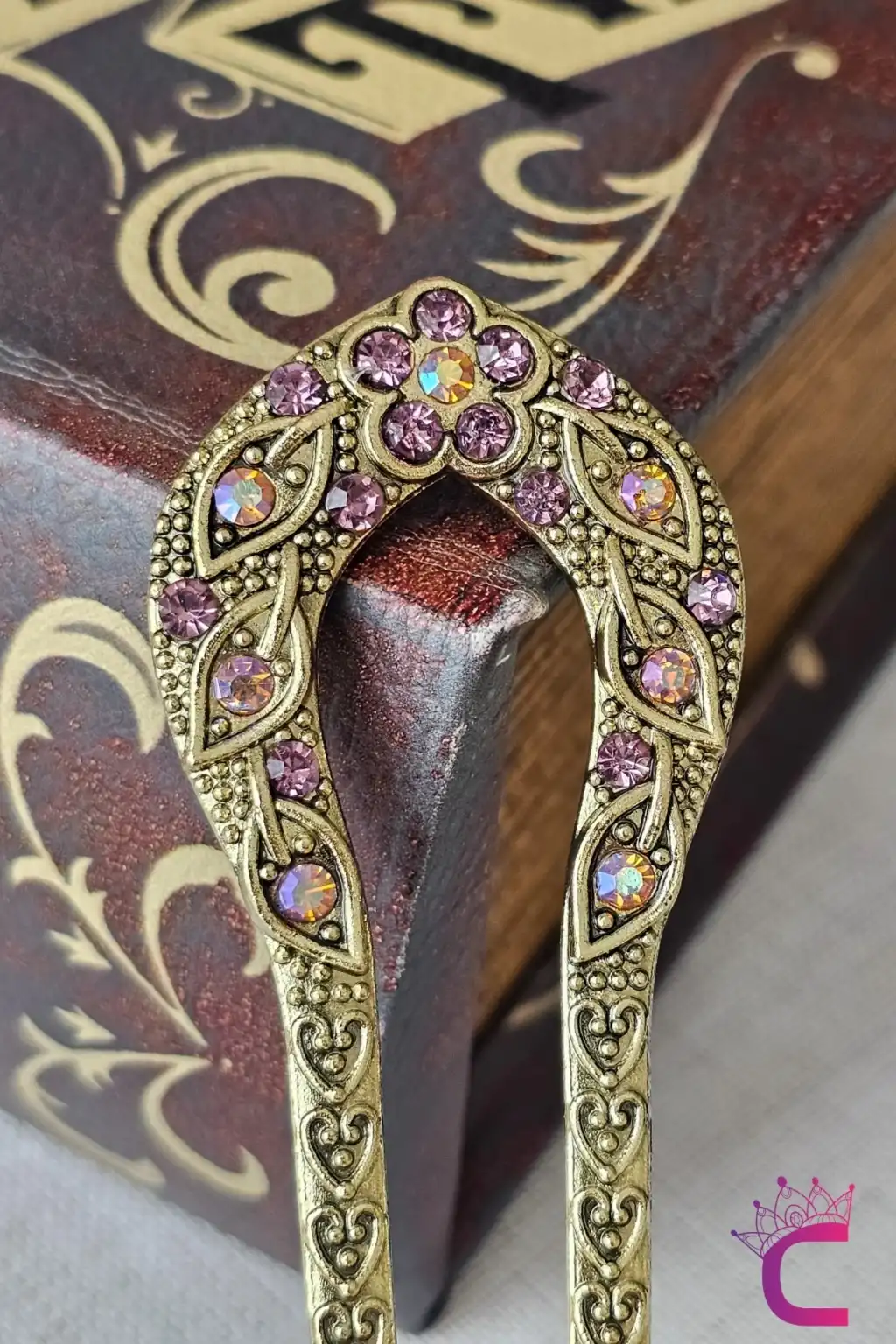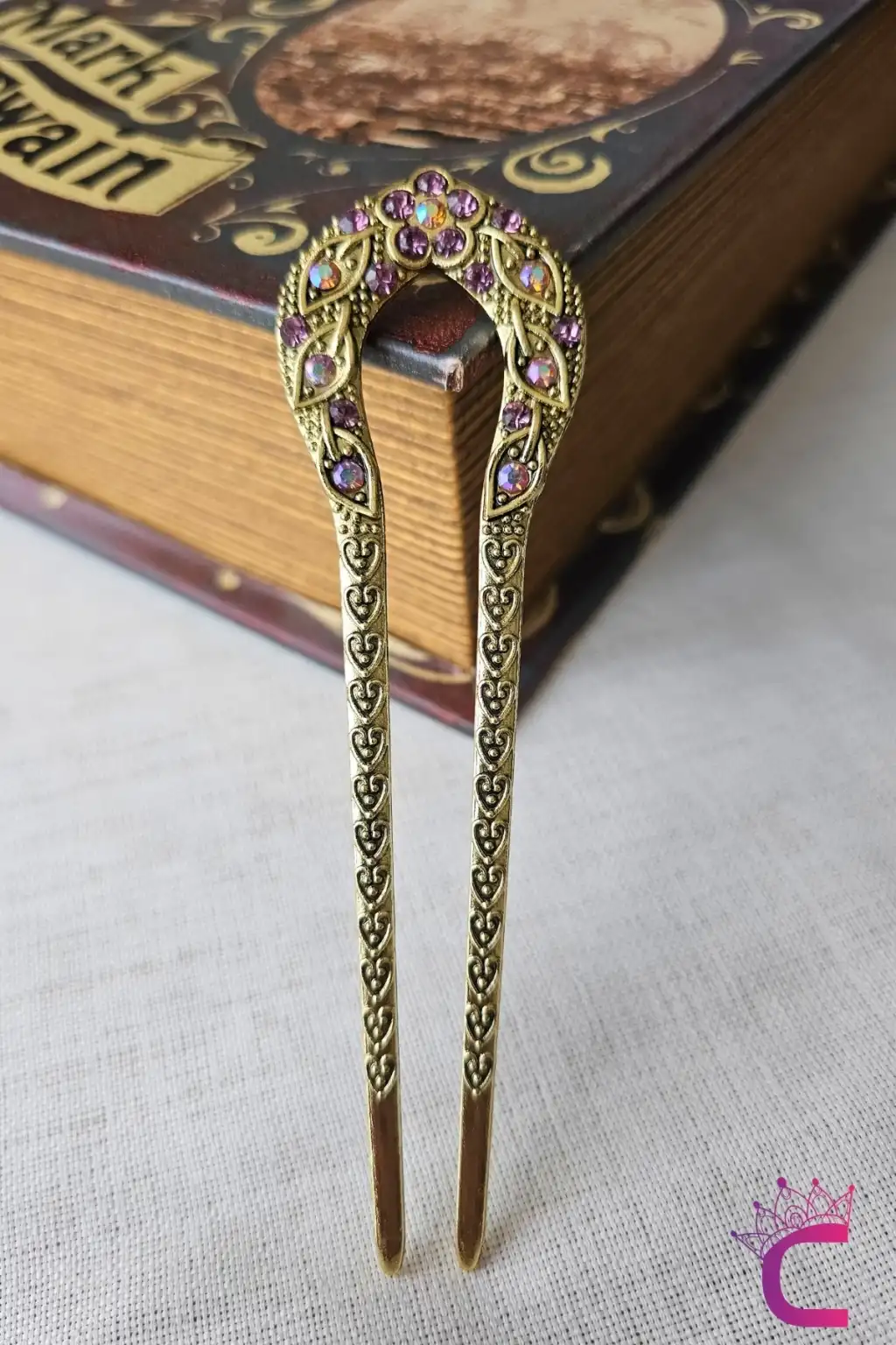 Vintage Çin Tarzı Mor Taşlı İşlemeli Topuz Tokası 12.5cm - Japon Topuz Çubuğu Metal Çubuk Toka