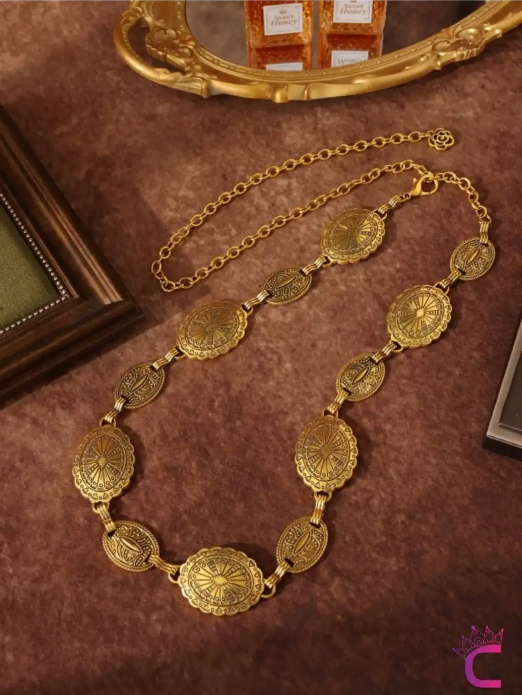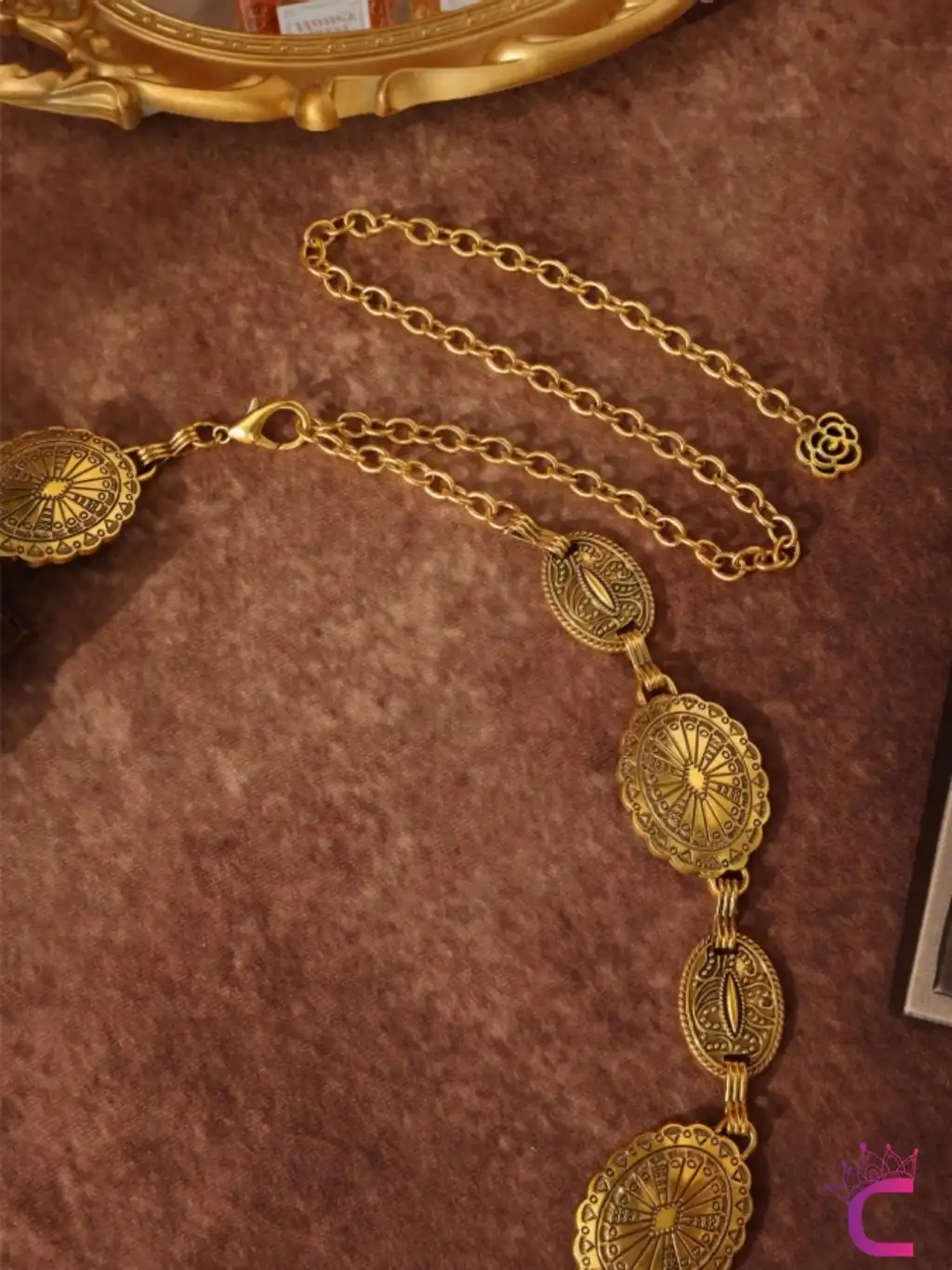 - Vintage oymalı çiçek geometrik desenleriyle dikkat çeken antik gold bel zinciri, şıklığınızı tamamlar.