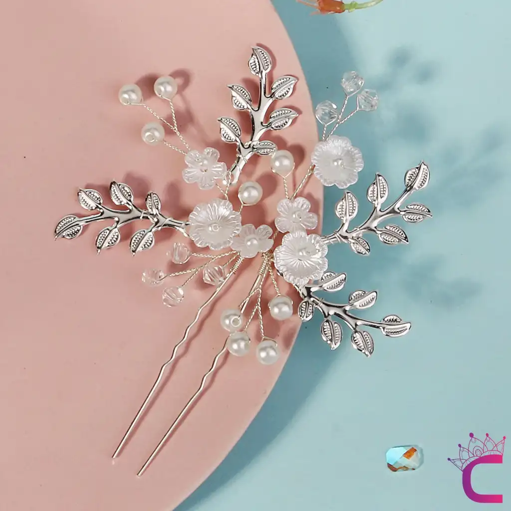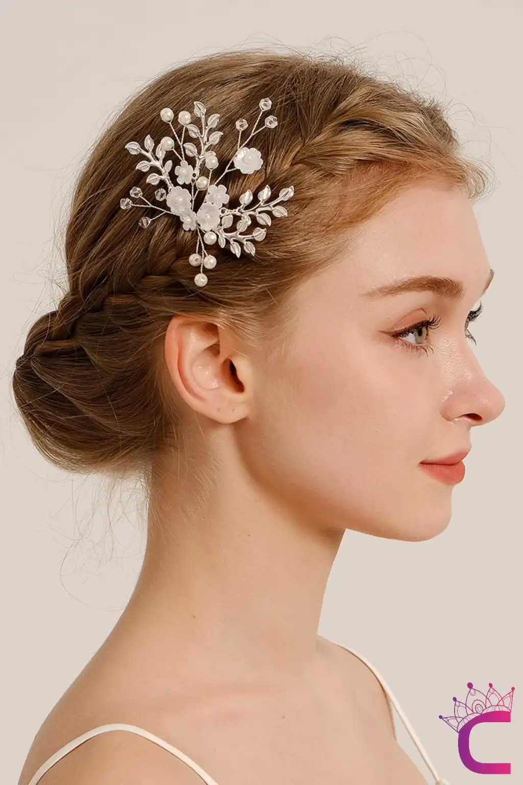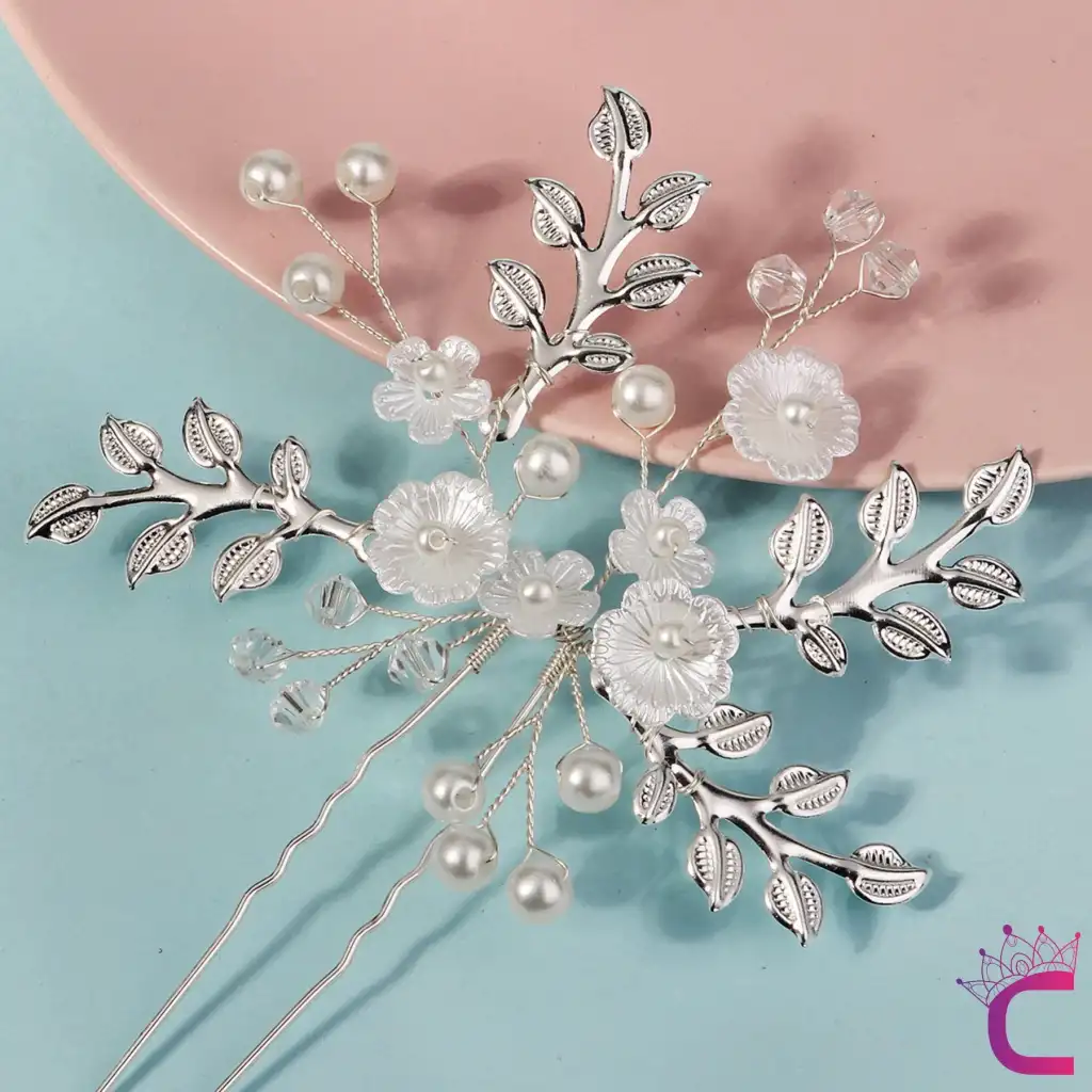 Yaprak Dalı Tasarım Çiçekli İncili Kristal Taşlı Gelin Tacı Firkete Toka Gümüş - Düğün Söz Aksesuar