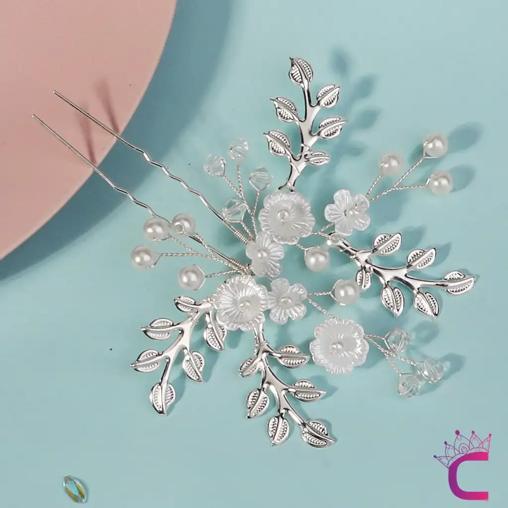Beyaz Gold Yapraklı Taşlı İncili Çiçekli Pens Gelin Tokası Tacı - Düğün Nişan Nikah Saç Aksesuarı