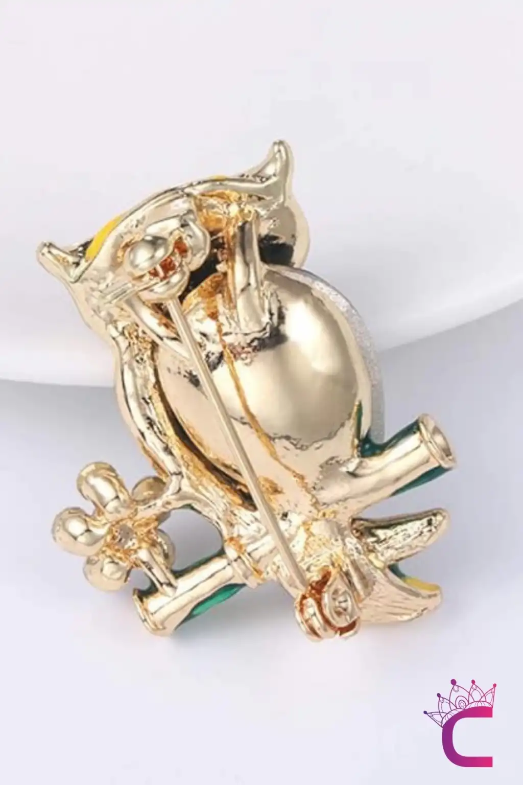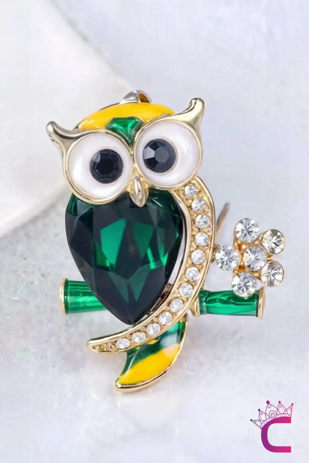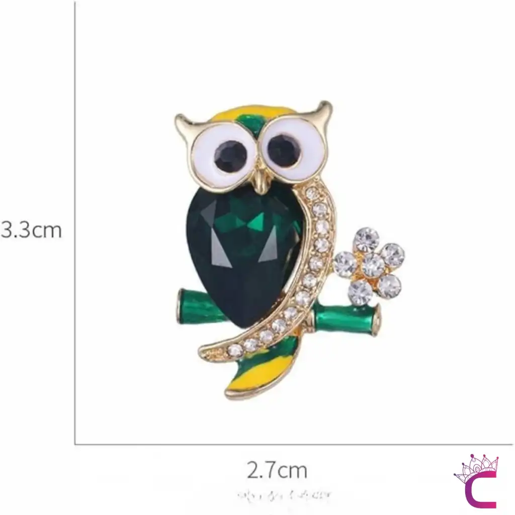 Yeşil Zümrüt Taşlı Kristal Çiçekli Tasarım C Baykuş Broş - Çanta Elbise Ceket Yaka İğnesi Broş