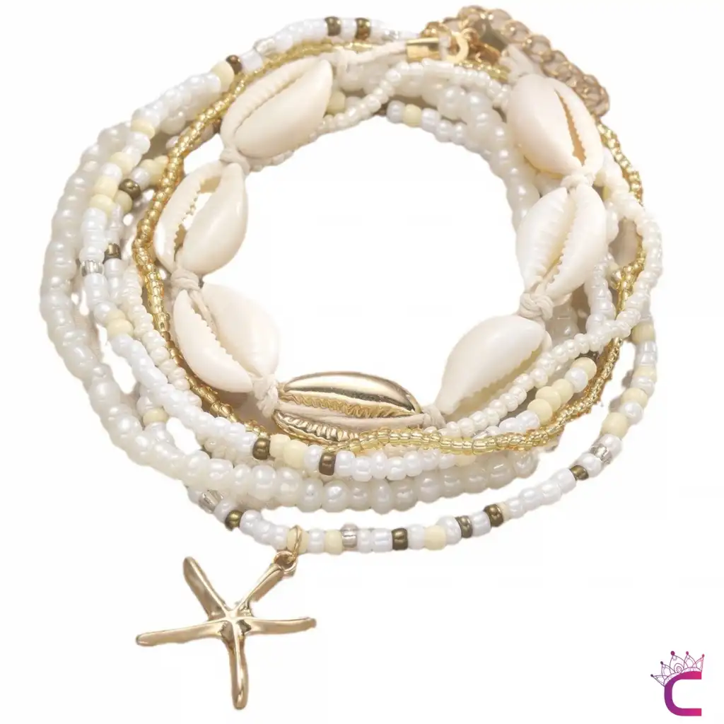 Yıldızlı Deniz Kabuğu 7'li Kombin Kadın Halhal - Plaj Ayak Takısı Yazlık Boncuklu Taşlı Halhal
