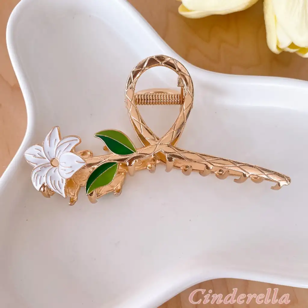 Zarif Papatya Çiçekli Zirkon Taşlı Yapraklı Gold Kadın Mandal Toka 10 cm - Metal Mandallı Saç Tokası