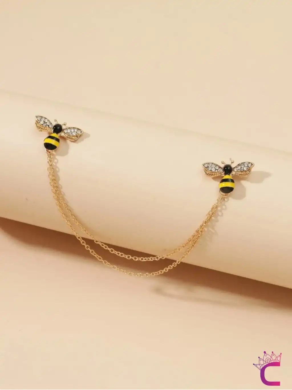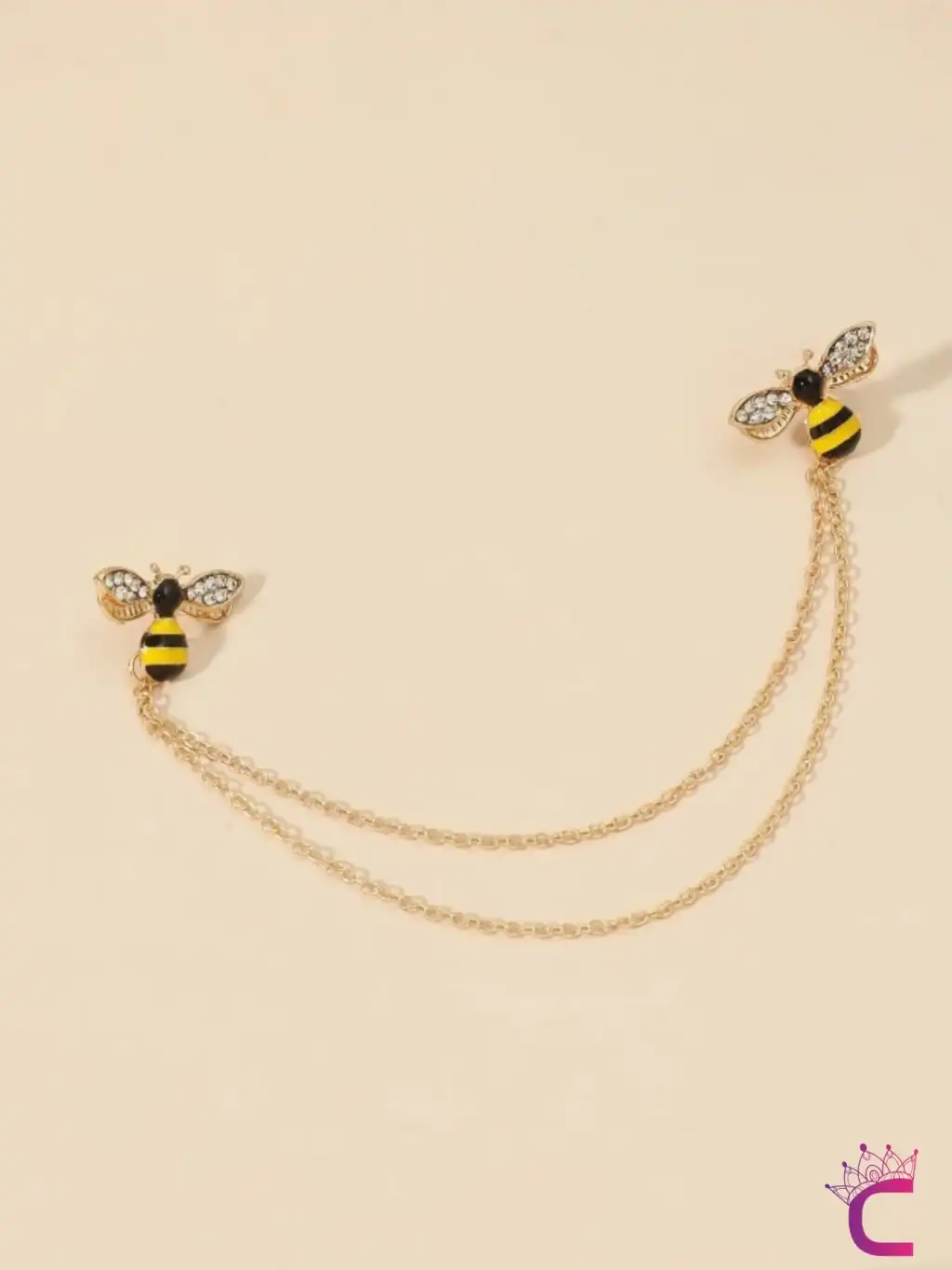 Zarif Arı Tasarım Gömlek Yaka Zinciri Broş - Hediyelik Zirkon Taşlı Gold Zincirli Ceket Yaka İğnesi
