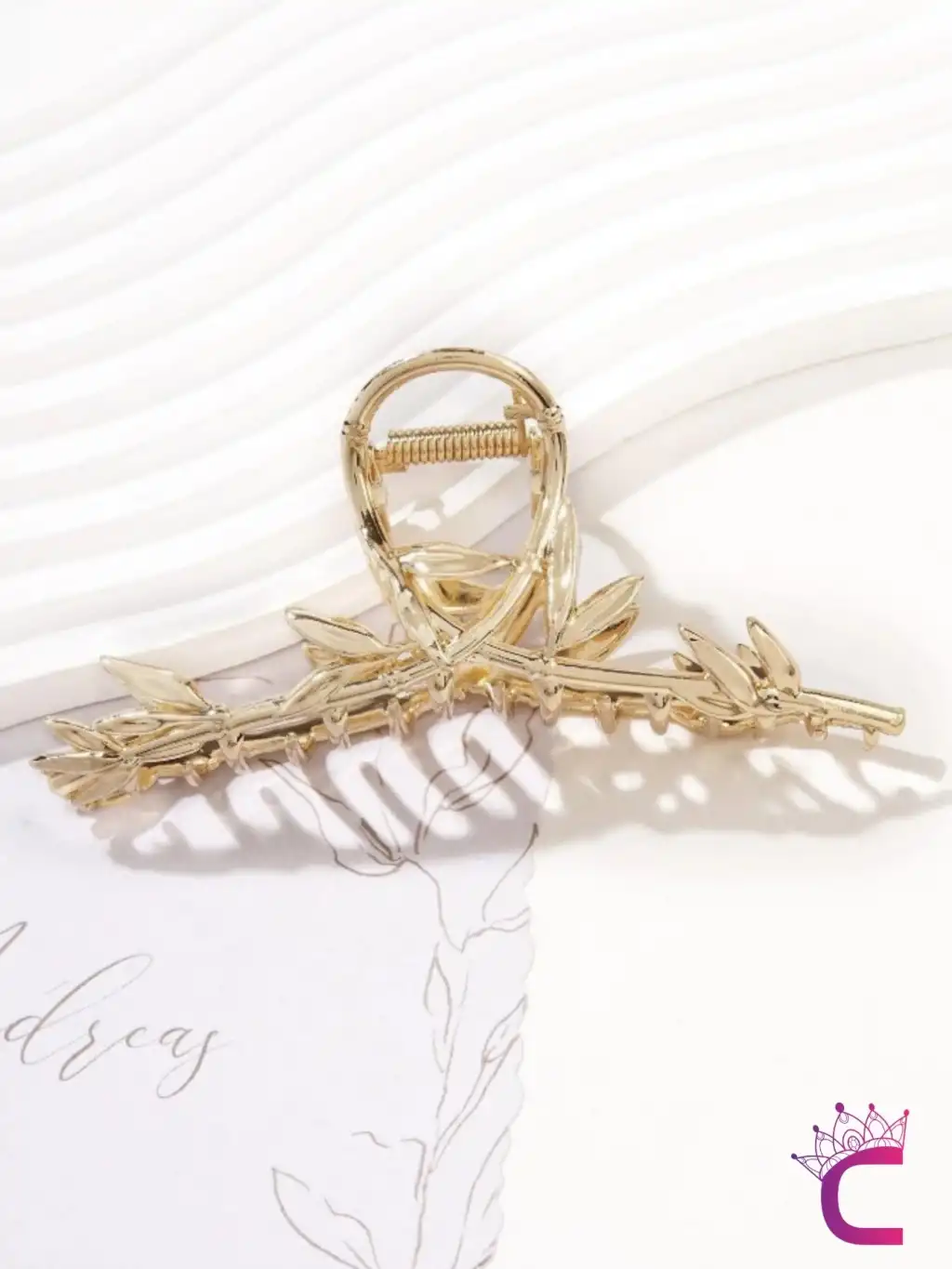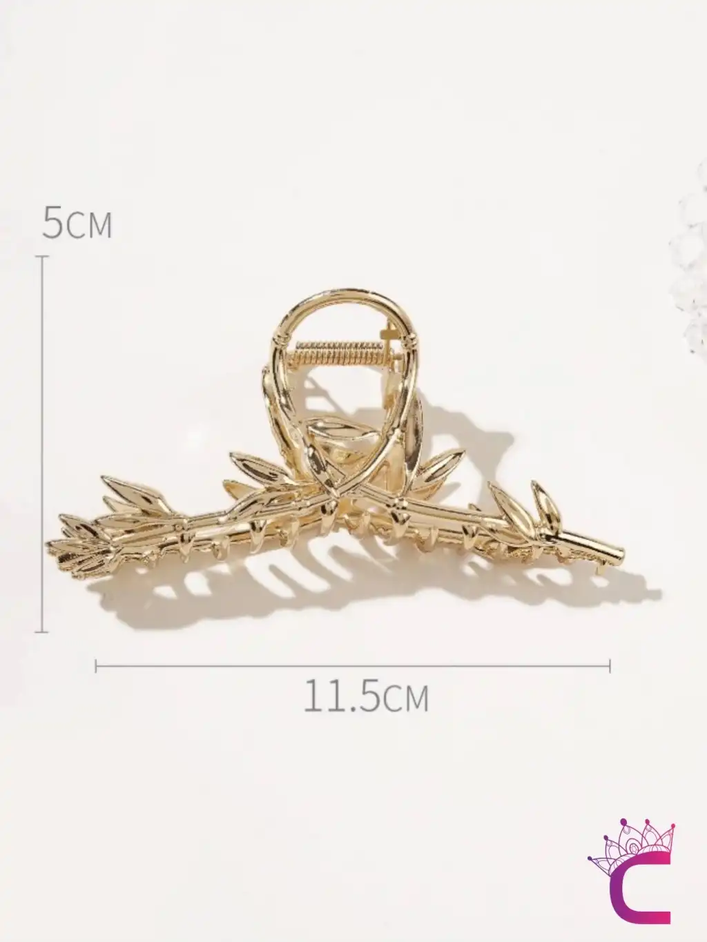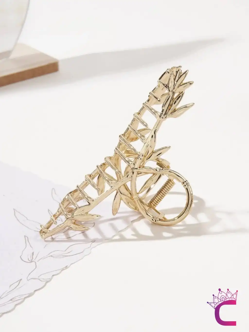 Zarif Bambu Yaprak Tasarım Gold Metal Kadın Mandal Toka 11.5cm - Büyük Boy Mandallı Saç Topuz Tokası