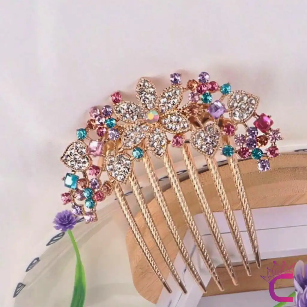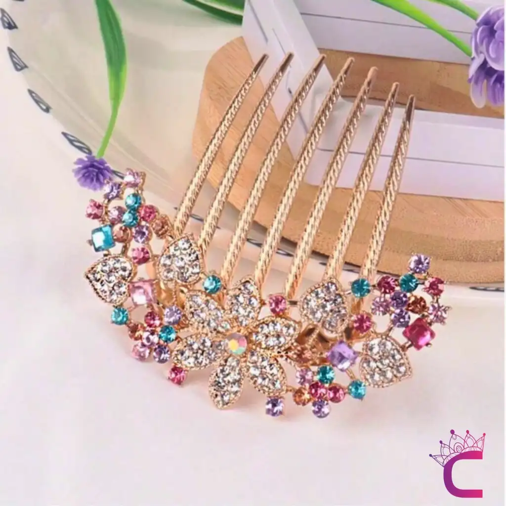 Zarif Çiçekli Kristal Taşlı Geniş Taraklı Saç Topuz Tokası Gökkuşağı Gelin Düğün Söz Tarak Toka