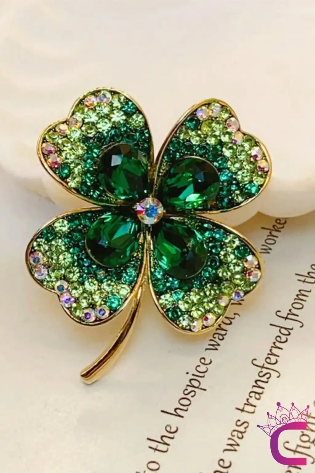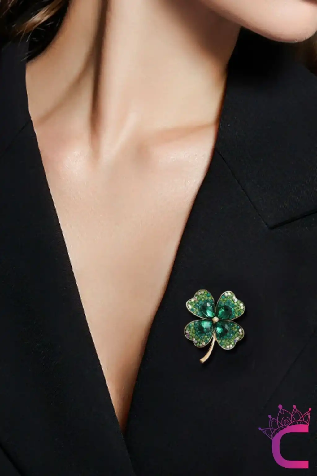 Zarif Çiçekli Kristal Taşlı Yeşil Yonca Tasarım Kadın Broş - Hediyelik Elbise Yaka İğnesi Broşu