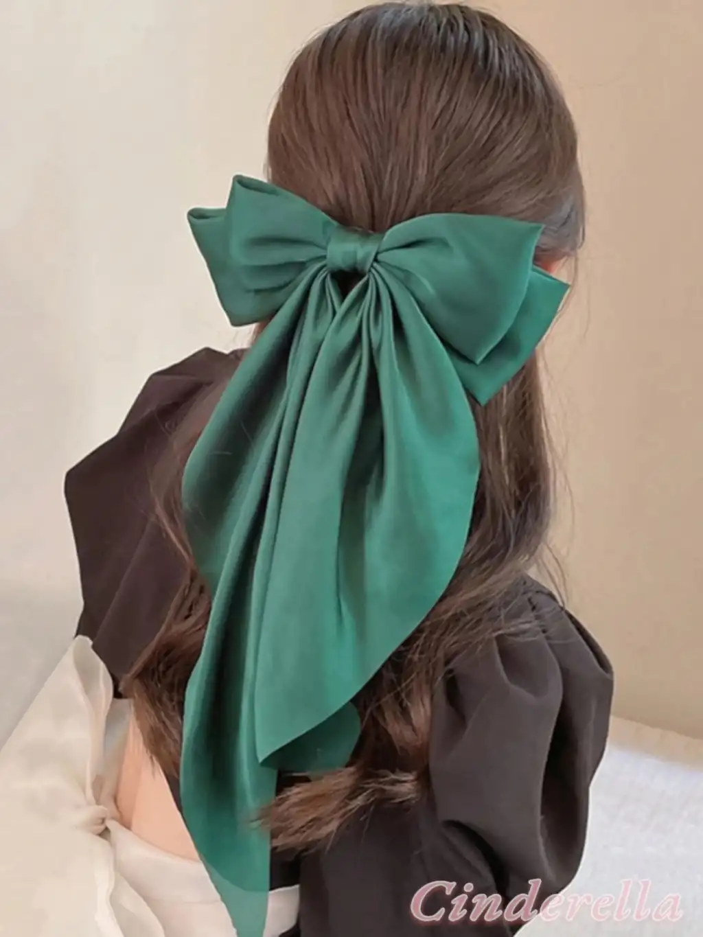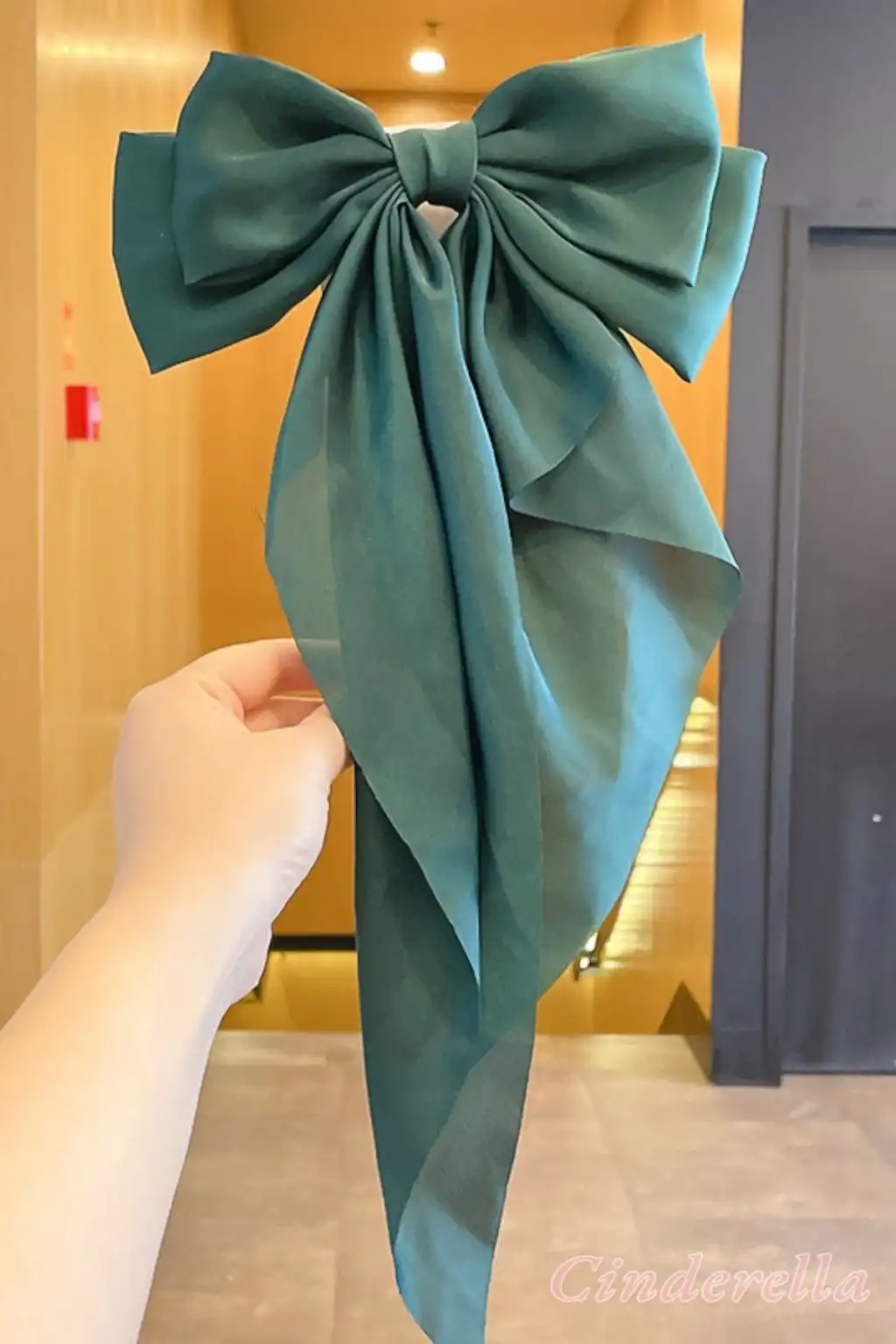 Zarif Kadın Saten Büyük Fiyonk Otomatik Toka Yeşil - Kurdele Fiyonklu Klipsli Saç Tokası
