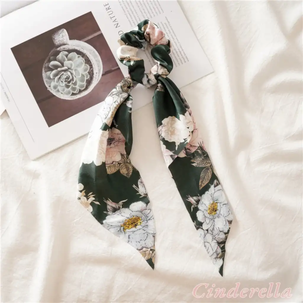 Zarif Lüks Saten Kumaş Fularlı Lastik Toka Haki Desenli - Kadın Scrunchie Lastikli Saç Tokası