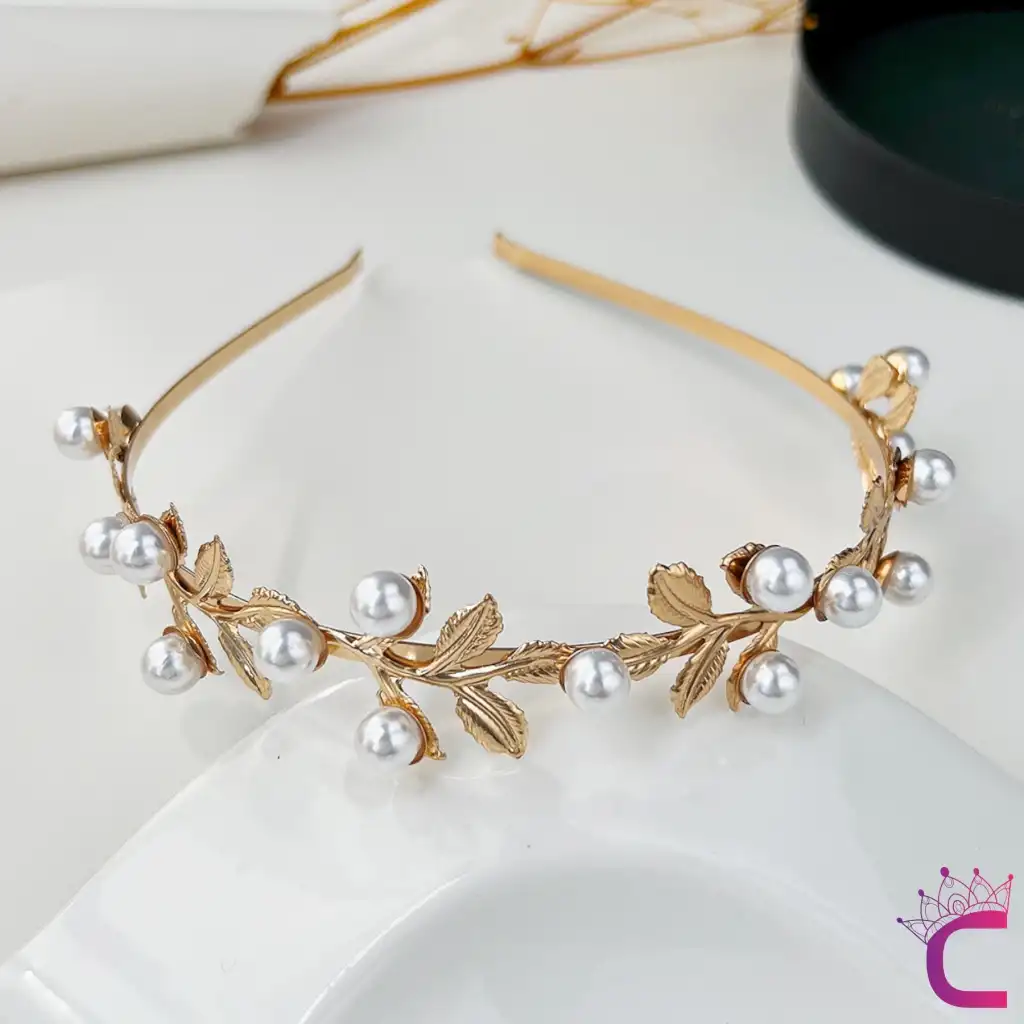 Zarif Yaprak İnci Detaylı Helen Gelin Tacı Saç Bandı Gold - Düğün Nişan Nikah Söz Saç Aksesuarı