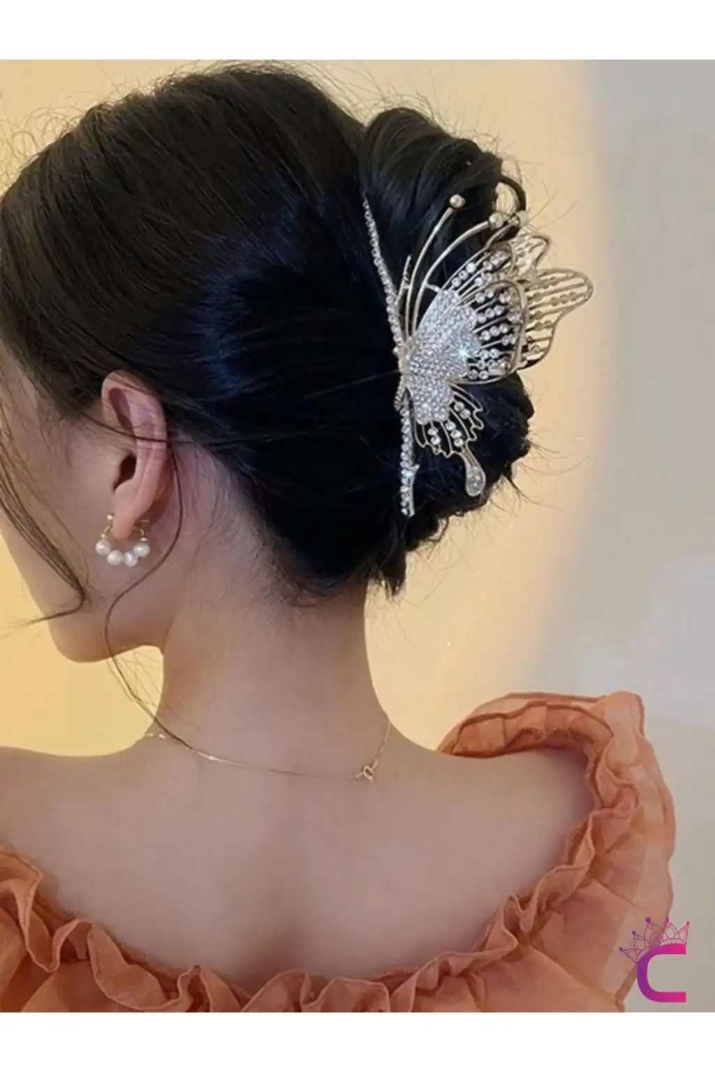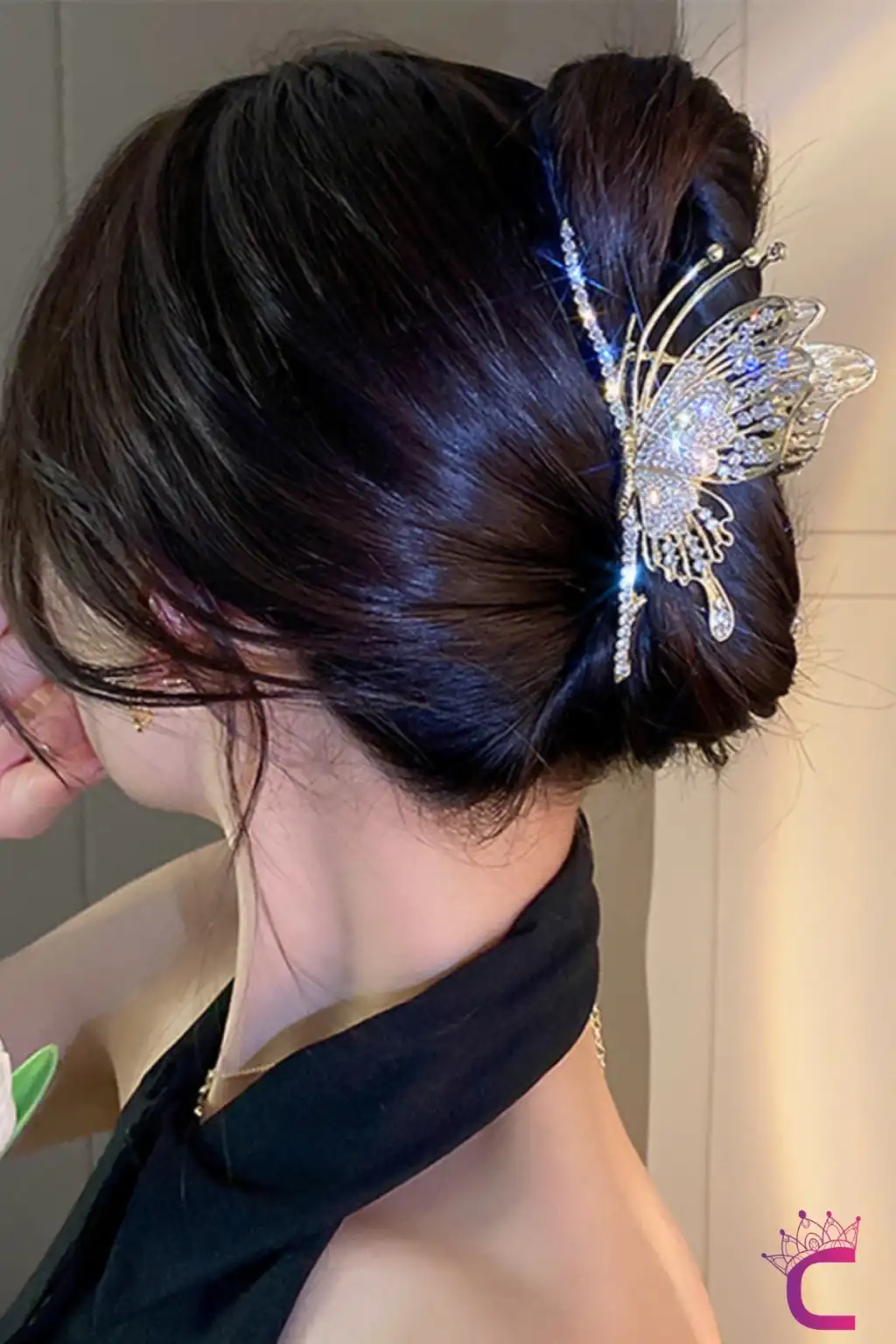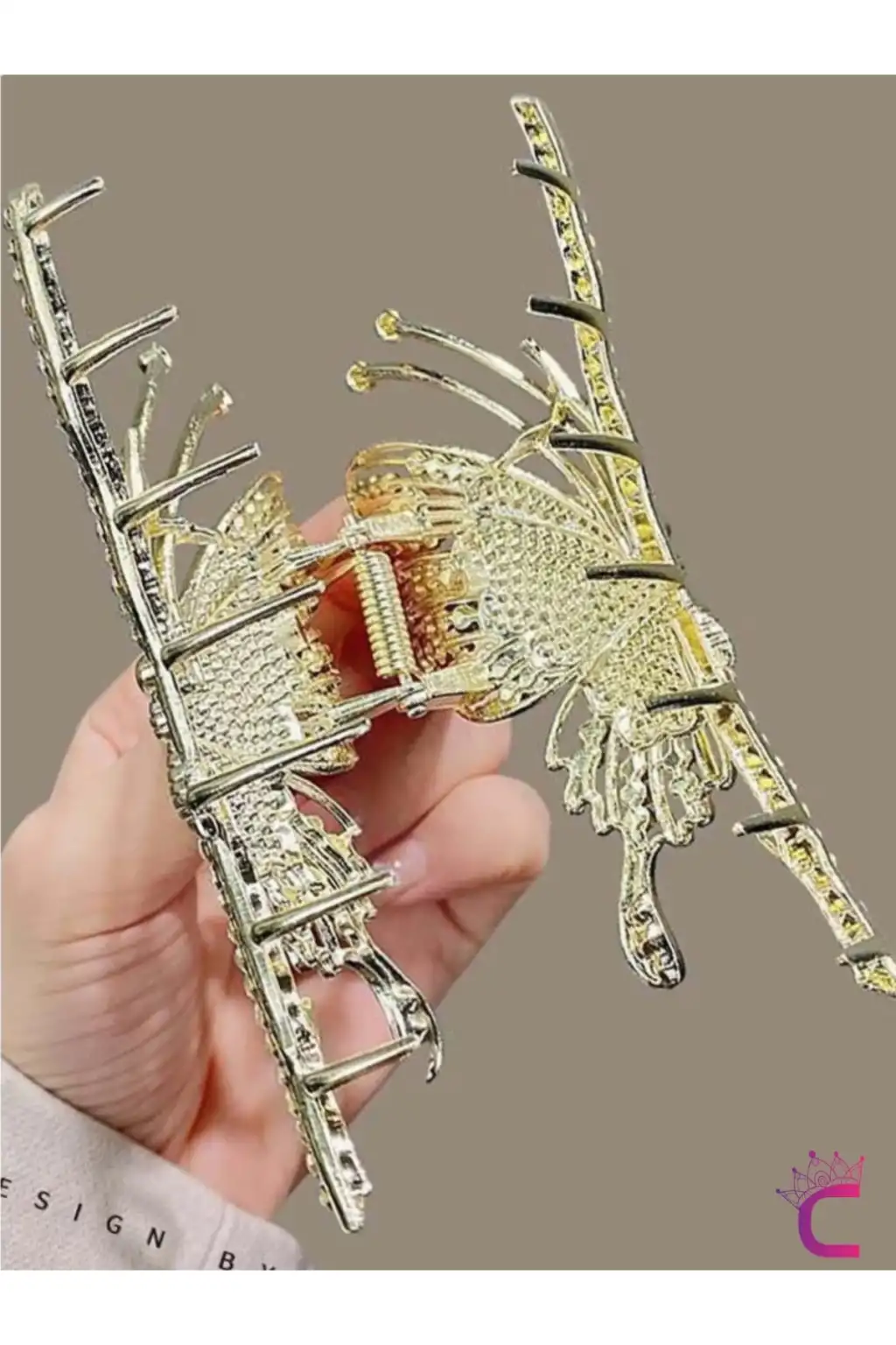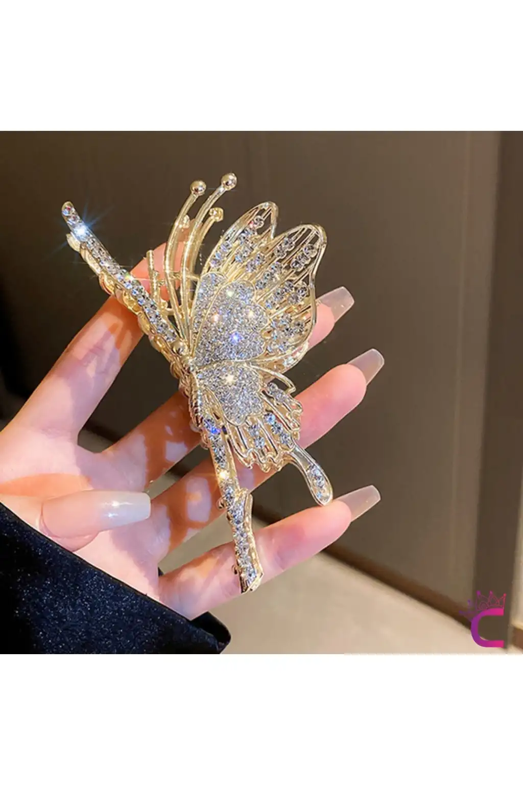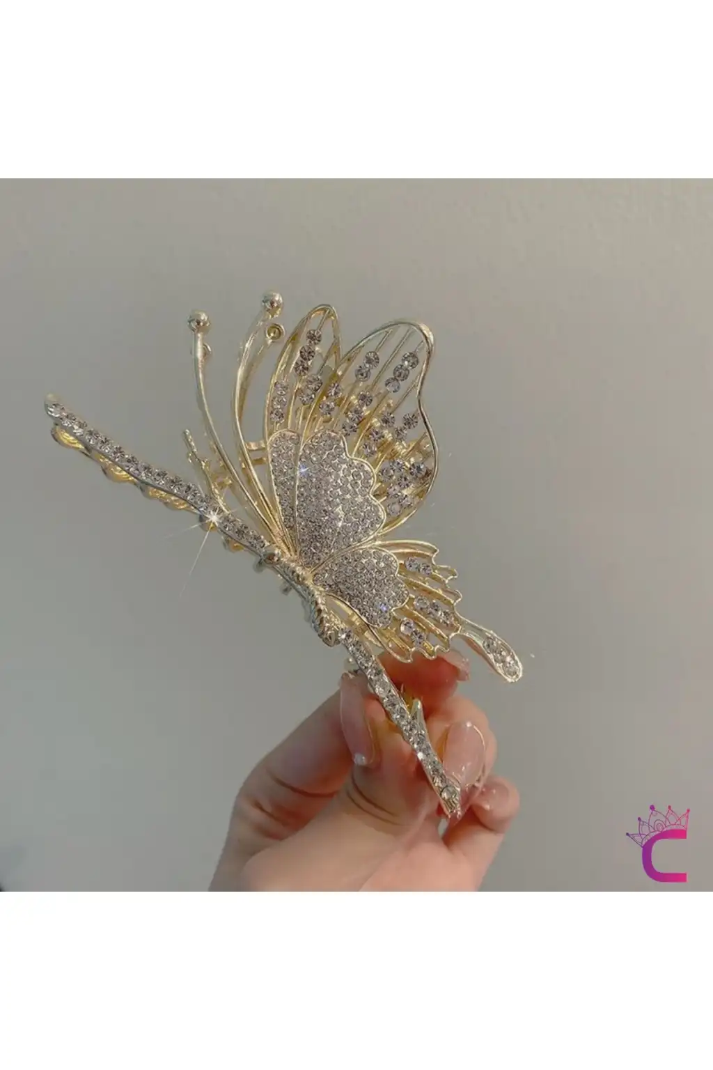 Zarif Zirkon Taşlı Kelebek Gold Metal Kadın Mandal Toka 11cm - Kelebekli Mandallı Saç Topuz Tokası