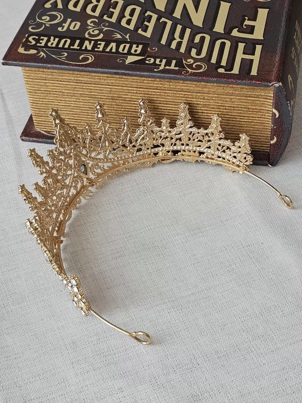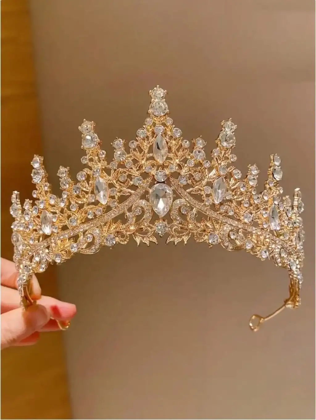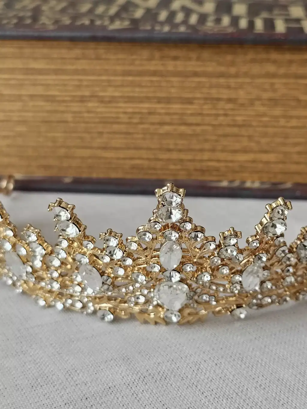 Zirkon Taş İşlemeli Kraliçe Prenses Gelin Tacı Gold - Kristal Taşlı Düğün Nişan Nikah Söz Aksesuar